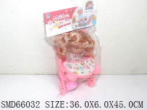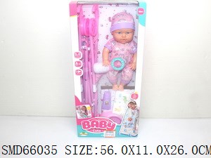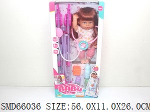 16寸喝水女娃带12声IC+塑料推车配听诊器/奶瓶/洗面奶/护发素/骰子